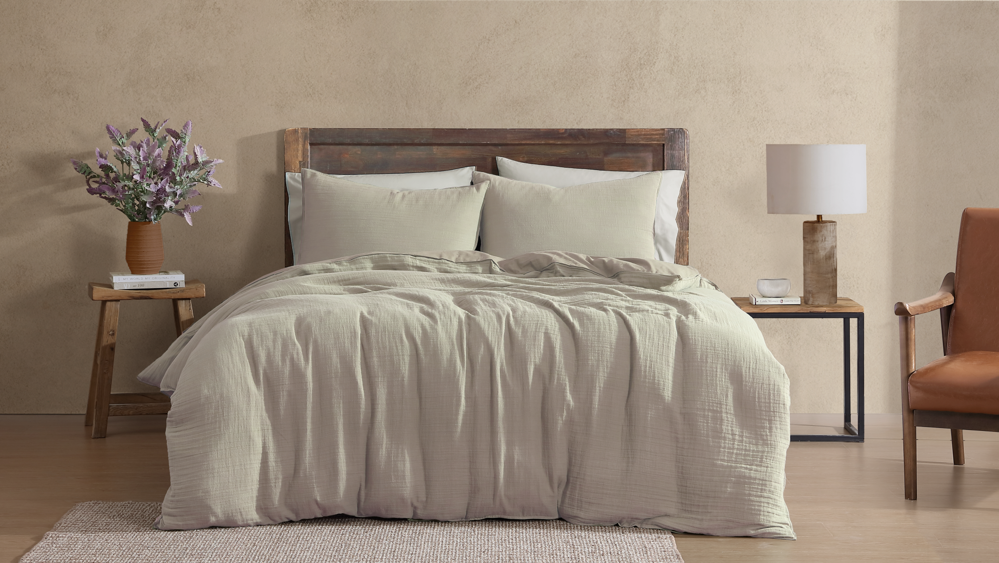 The Ardor Earth Quilt Cover Set offers natural texture and comfort with its beautifully soft design. The front is crafted from 100% cotton double gauze, giving it a lightweight, airy feel with a relaxed, crinkled finish, while the reverse is made from smooth 100% cotton for added softness against the skin. Effortlessly stylish and breathable, it’s the perfect blend of comfort and understated elegance for everyday living.