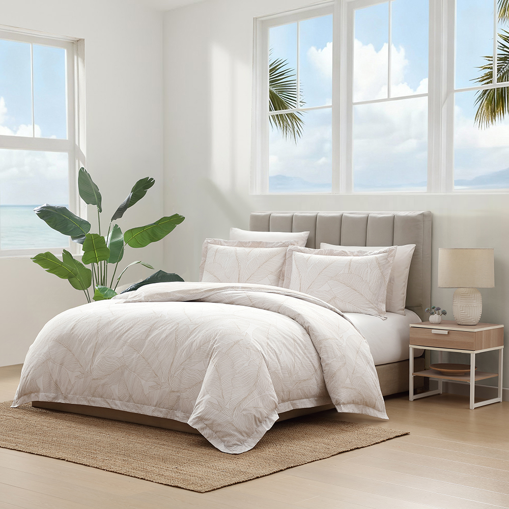 Soft and serene, the Pebble Palm Quilt Cover Set by Tommy Bahama brings effortless island style to your bedroom. In a calming light beige tone with a subtle palm leaf pattern, it adds a touch of relaxed elegance and coastal charm to any space. Perfect for creating that breezy, laid-back look, no passport required.